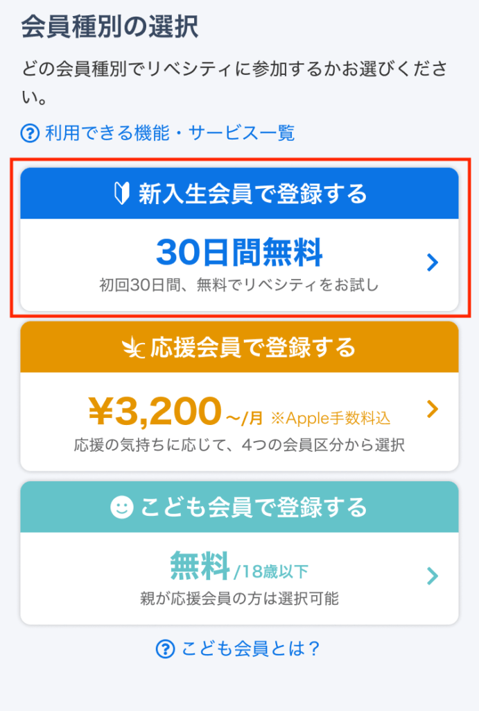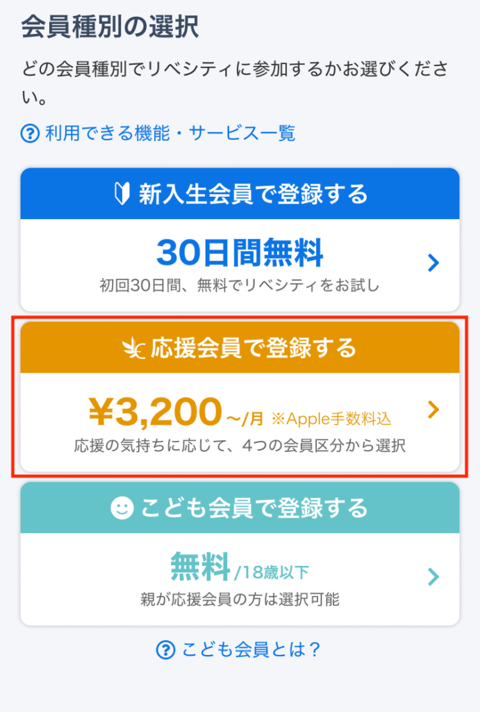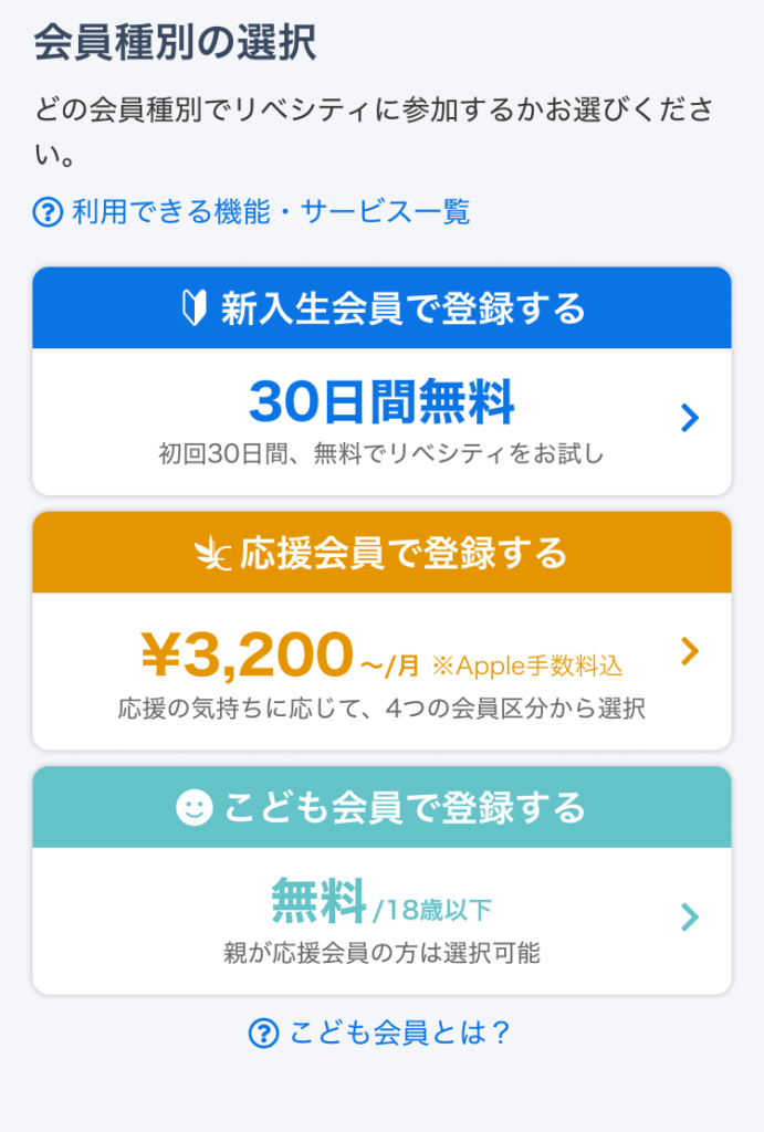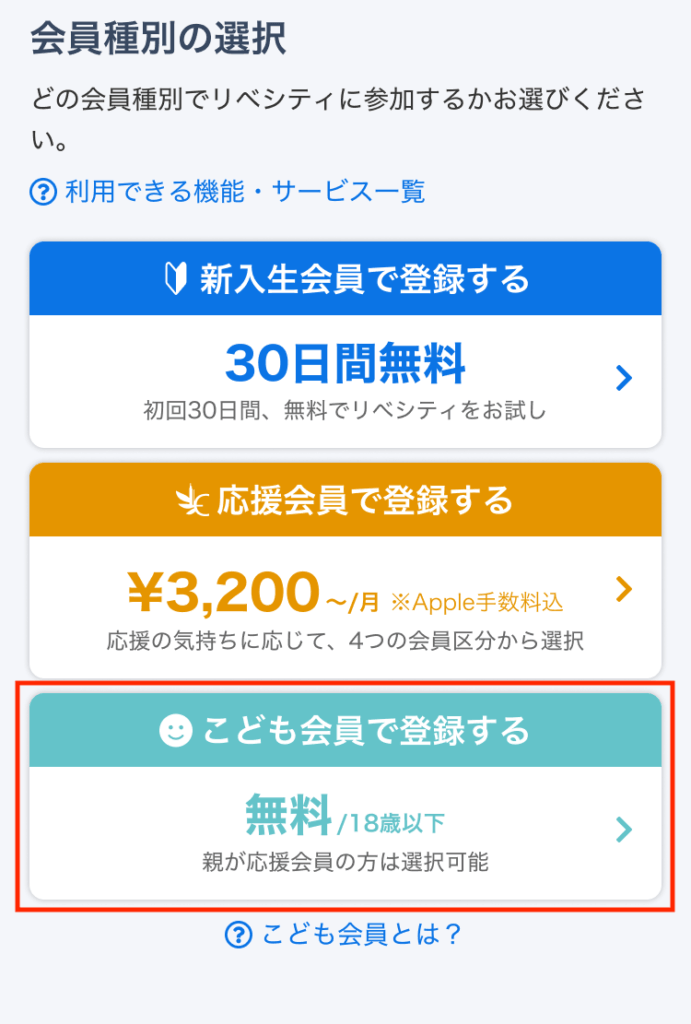 親がリベシティの応援会員である場合に限り、18歳以下の方は無料の「こども会員」として登録できます。