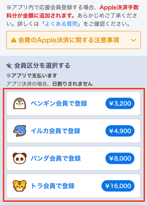 - iOS(iPhone・iPad)のアプリ上で応援会員登録する場合、App Store経由のお支払いとなり、応援会費はApple決済手数料【30%】が上乗せされた金額になります。