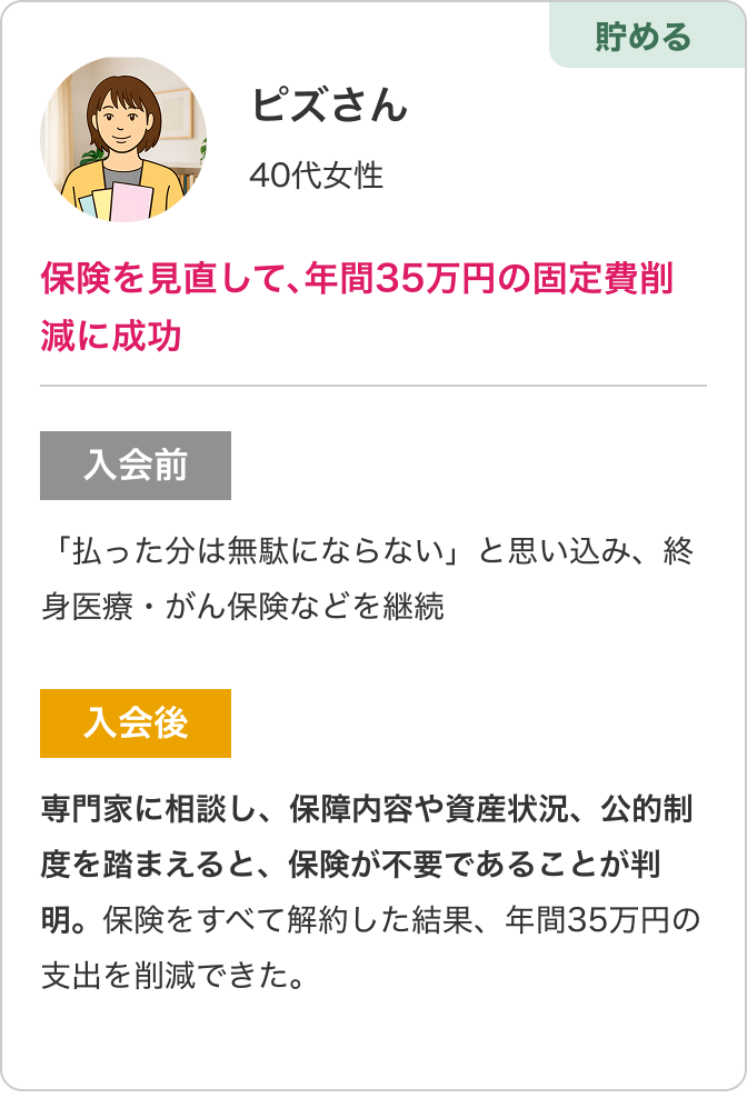 専門家に相談し、保障内容や資産状況、公的制度を踏まえると、保険が不要であることが判明。保険をすべて解約した結果、年間35万円の支出を削減できた。