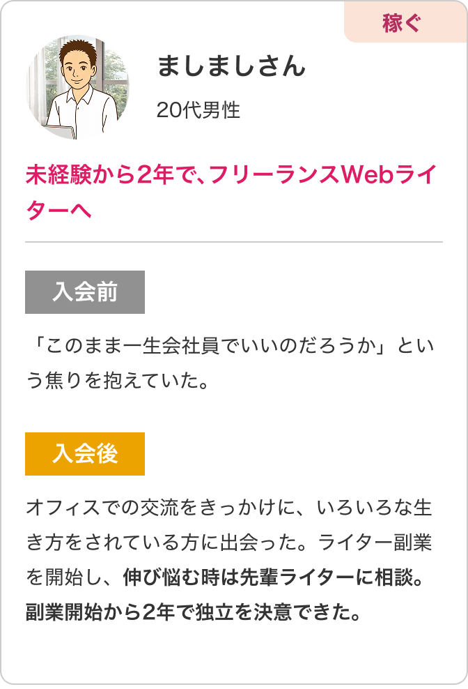 オフィスでの交流をきっかけに、いろいろな生き方をされている方に出会った。ライター副業を開始し、伸び悩む時は先輩ライターに相談。副業開始から2年で独立を決意できた。