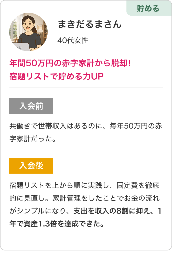 宿題リストを上から順に実践し、固定費を徹底的に見直し。家計管理をしたことでお金の流れがシンプルになり、支出を収入の8割に抑え、1年で資産1.3倍を達成できた。