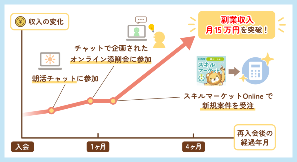 そのときに副業の具体的な目標も聞かれたので、とりあえず「パートと事業収入合わせて月5万円」と回答。すると翌日、朝活で出会った方からスキルマーケットで初めて記帳相談の依頼をいただいたんです。目標を宣言してすぐの出来事だったので、本当に驚きました。