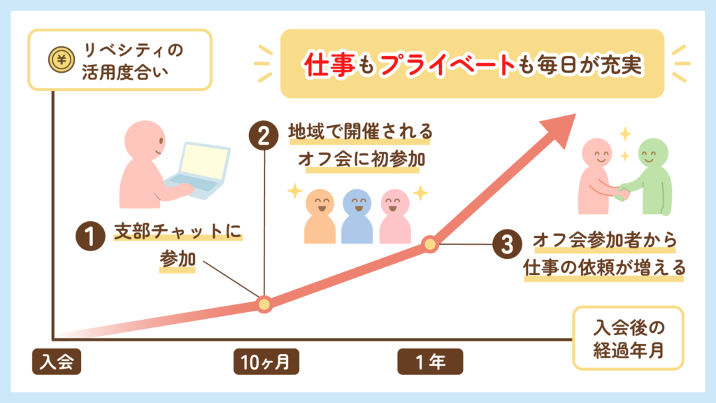 地方へ引っ越したばかりの私は、知り合いもいない状態でした。そこで、近くに住むリベシティ会員さんと直接繋がって交流してみたいと思い、自分が住む地域の支部チャットに入りました。チャットでのみなさんのやりとりを見ていると、とても和やかな雰囲気。