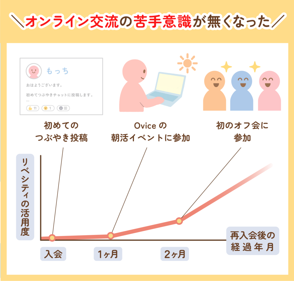 公務員として働くもっちさんは、育休を機にリベシティへ再入会しました。オンラインでのコミュニケーションが苦手で、つぶやきボタンを押すまで30分以上悩みながらも、勇気を出して一歩を踏み出しました。今では、交流の楽しさを知り、新しい世界に触れ、自分の考え方の変化にも気づくまでに。その軌跡をたどります。