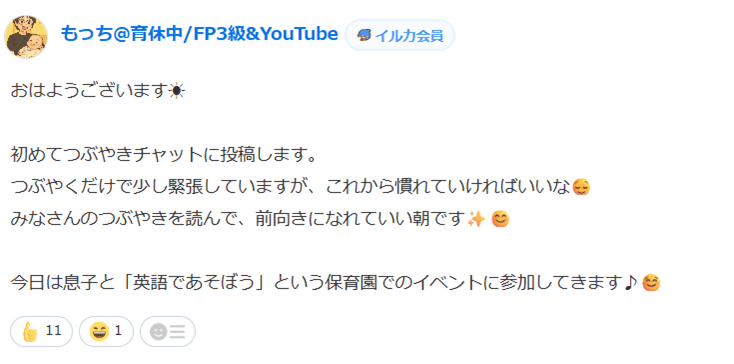 そこで「リベシティに入ってまずやること3選」を参考に、一番手軽そうなつぶやき機能で投稿してみることにしたんです。つぶやきの内容には当日早朝から30分悩み、さらに投稿ボタンを押すまで15分かかりました。冷や汗がじわりと流れる中で「リベの人たちは優しいから大丈夫」という夫の言葉を信じて、思い切って投稿しました。