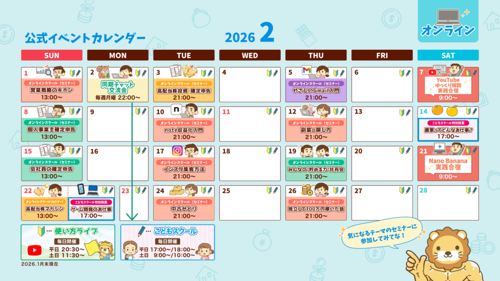 各内容は基本的に1回完結型なので、どのタイミングでスタートしても問題なく受講いただけます。