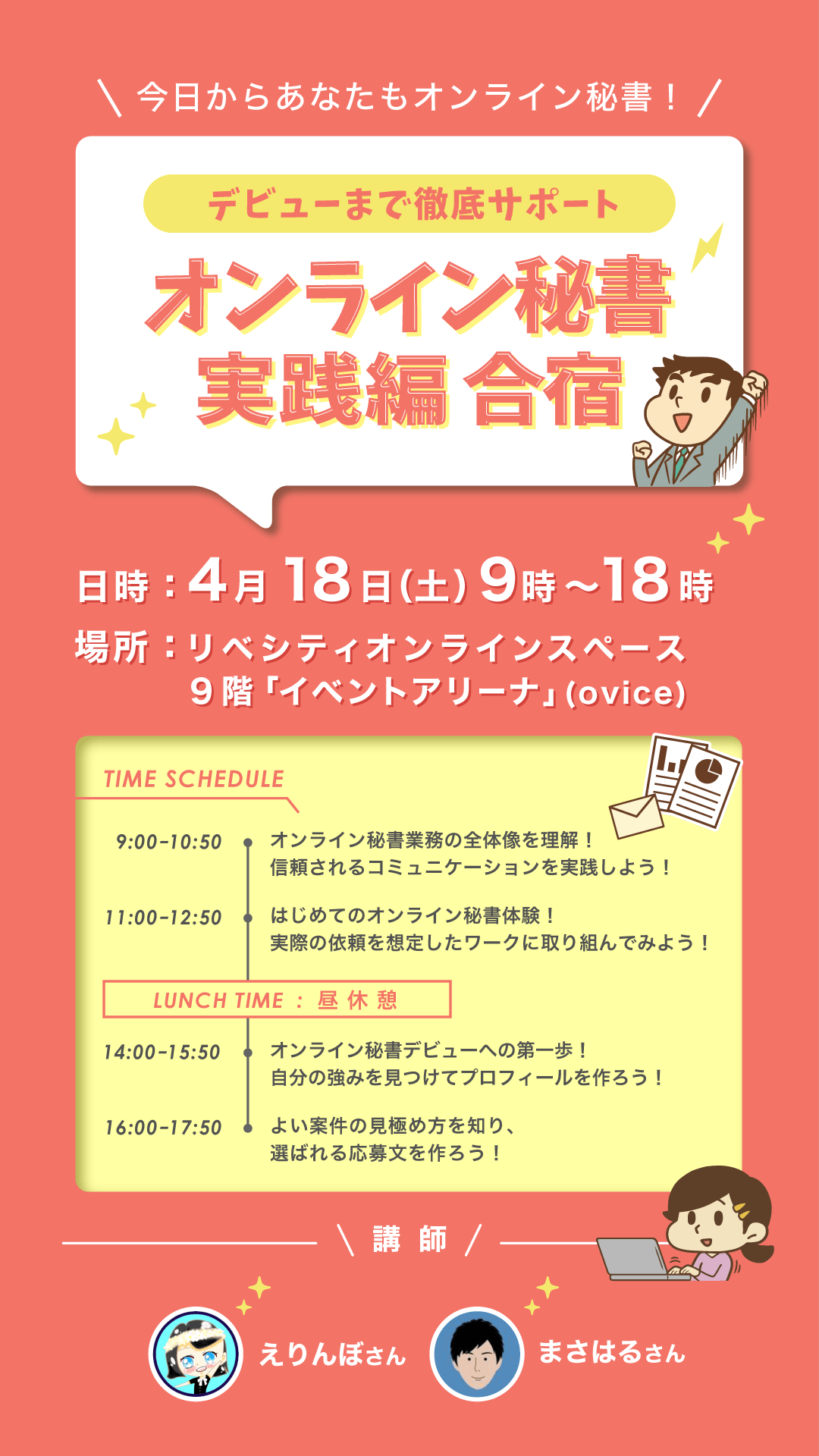 | 内容 | 今回のテーマは「オンライン秘書 実践編合宿」💻 前回の「準備編」からステップアップして、実際の業務を体験しながら、仕事につなげる力を身につけていきます💪🏻 オンライン秘書必携のツール設定から応募文の作成まで、一連の流れを実践しながら、実務のイメージをつかんでいきましょう✨ ※4月4日に開催した「準備編」では、GoogleツールやAIツールなど、オンライン秘書に必要なITスキルを基礎から学びました💡 基礎から確認しておきたい方は、アーカイブをご覧ください😊(事前視聴なしでもご参加いただけます) <1コマ目> 9:00〜10:50 ✅ オンライン秘書業務の全体像を理解!信頼されるコミュニケーションを実践しよう! <2コマ目> 11:00〜12:50 ✅ はじめてのオンライン秘書体験!実際の依頼を想定したワークに取り組んでみよう! ※講師:えりんぼさん ![]() <3コマ目> 14:00〜15:50 ✅ オンライン秘書デビューへの第一歩!自分の強みを見つけてプロフィールを作ろう! <4コマ目> 16:00〜17:50 ✅ よい案件の見極め方を知り、選ばれる応募文を作ろう! ※講師:まさはるさん ![]() 💬 「準備編の次に何をすればいいかわからない…」 💬 「実際の仕事の流れがイメージできていない…」 という方も安心してご参加ください😊 💡 準備いただきたいこと・留意事項は、以下の「合宿の詳細」からご確認ください |