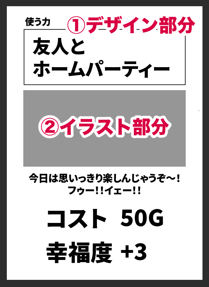 - カードのタイトルや説明文に合わせてイラスト部分(灰色の箇所)に入れる挿絵を描いてください。