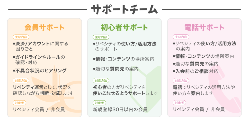 リベシティでは、お問い合わせ内容に応じた、3つのサポートチーム体制を設けています。